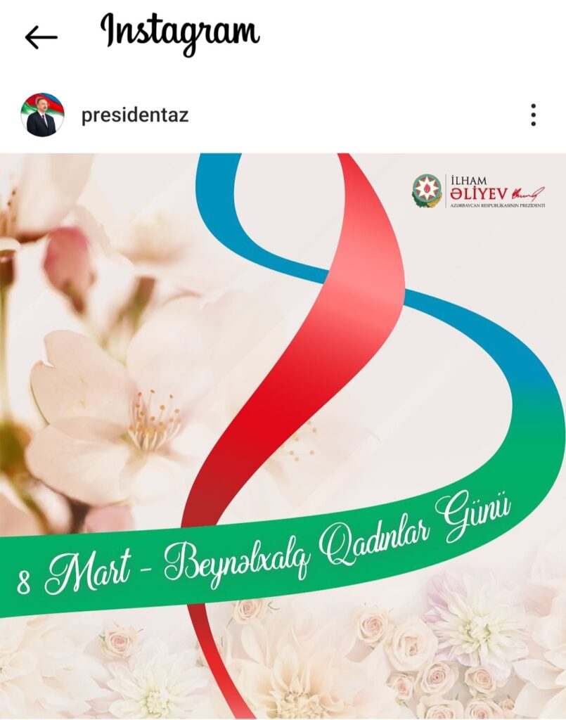 Azərbaycan Respublikasının Prezidenti İlham Əliyev 8 Mart – Beynəlxalq Qadınlar Günü ilə bağlı sosial şəbəkə hesablarında paylaşım edib.